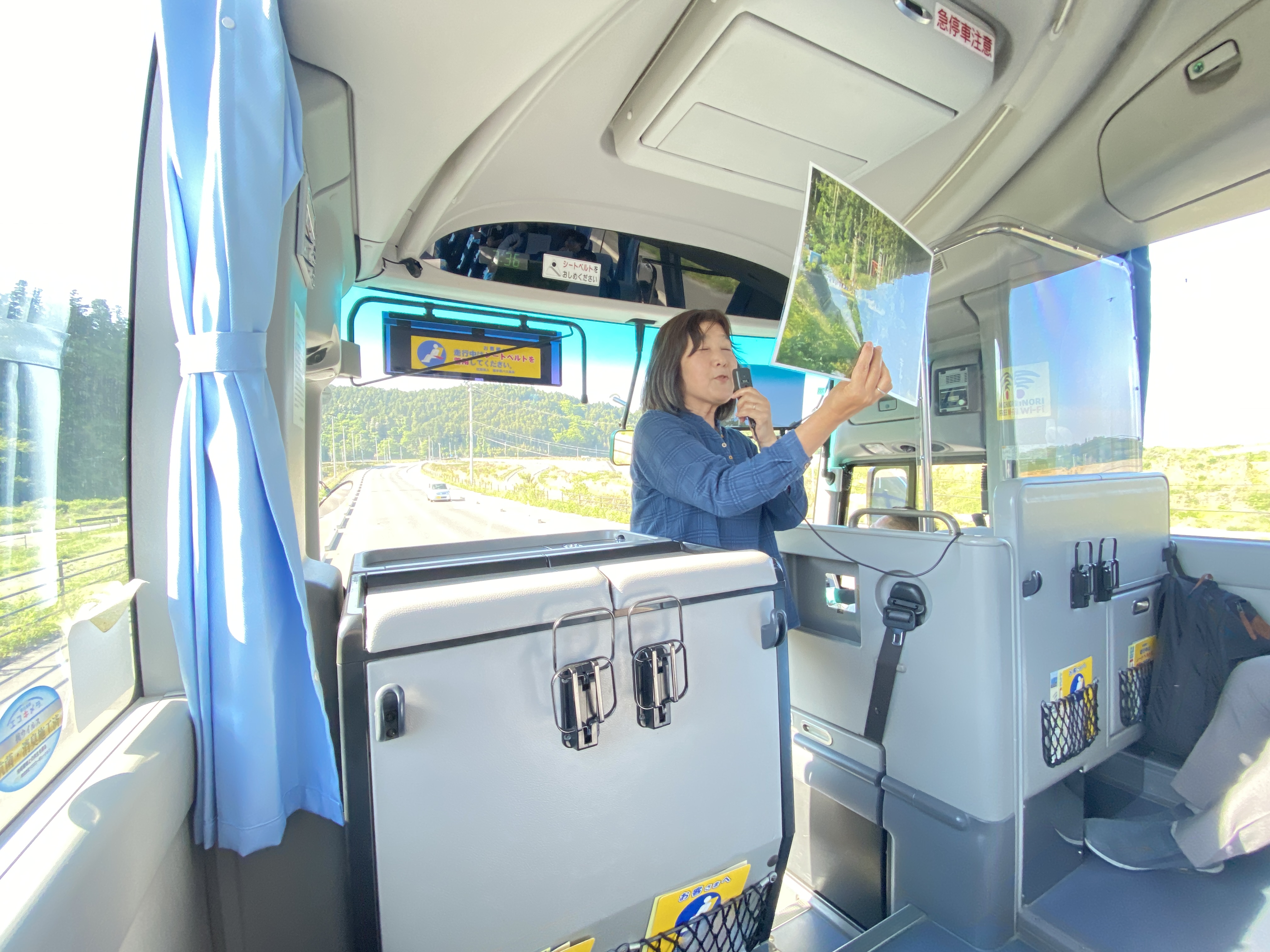 震災学習のもう一つのプログラムは、生徒たちの乗るバスに震災を経験した語り部が乗車し、当時のお話を直接聞きながら、町内施設を巡るものです。道中のバス車内では語り部の方から、車窓から覗く風景の当時の状況や被災体験について語っていただきました。