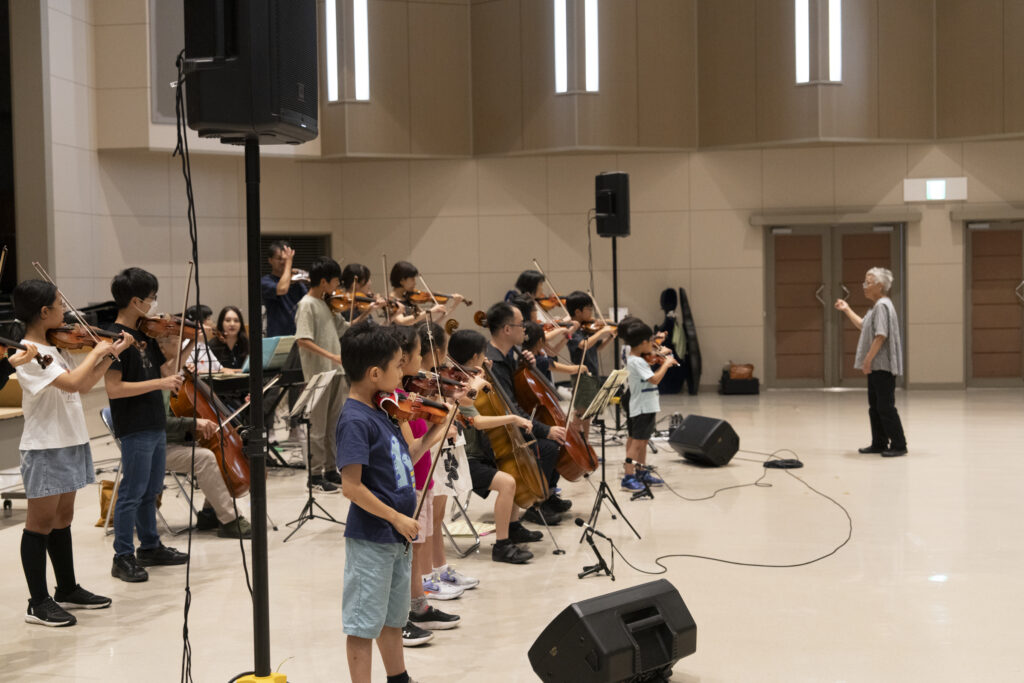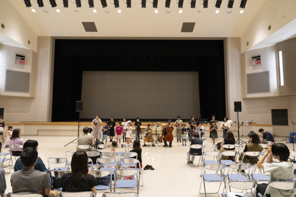 初日は 南三陸町ベイサイドアリーナ文化交流ホールでの練習からスタート。実際に、式典やコンサートで使われることも多い本格的なホール。フラットな面積が広いので、レイアウトの自由度が高く、合奏の隊形もスムーズに調整できました。バイオリン、チェロ、ピアノを学ぶ4歳から50代まで、年代も幅広い生徒さんが、一堂に会して真剣な表情で音を合わせます。普段は別々の教室で習う生徒さんたちにとって、この合宿は特別な時間です。休憩時間には、指導者のみなさんの計らいで南三陸のおやつが配られ、笑顔がこぼれる場面も見られました。