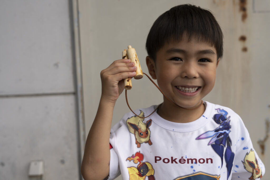 海のイメージが強い南三陸ですが、町の7割以上は山林です。その森林から出る未利用資源である小枝を使って、自分だけの笛作りを楽しみました。あらかじめ笛の形に用意されている枝を、サンドペーパーや小刀、かんななど、年齢に応じた道具を使って磨いていきます。最後にえごま油を塗ってツヤを出したら完成!大喜びで吹き鳴らしていました。