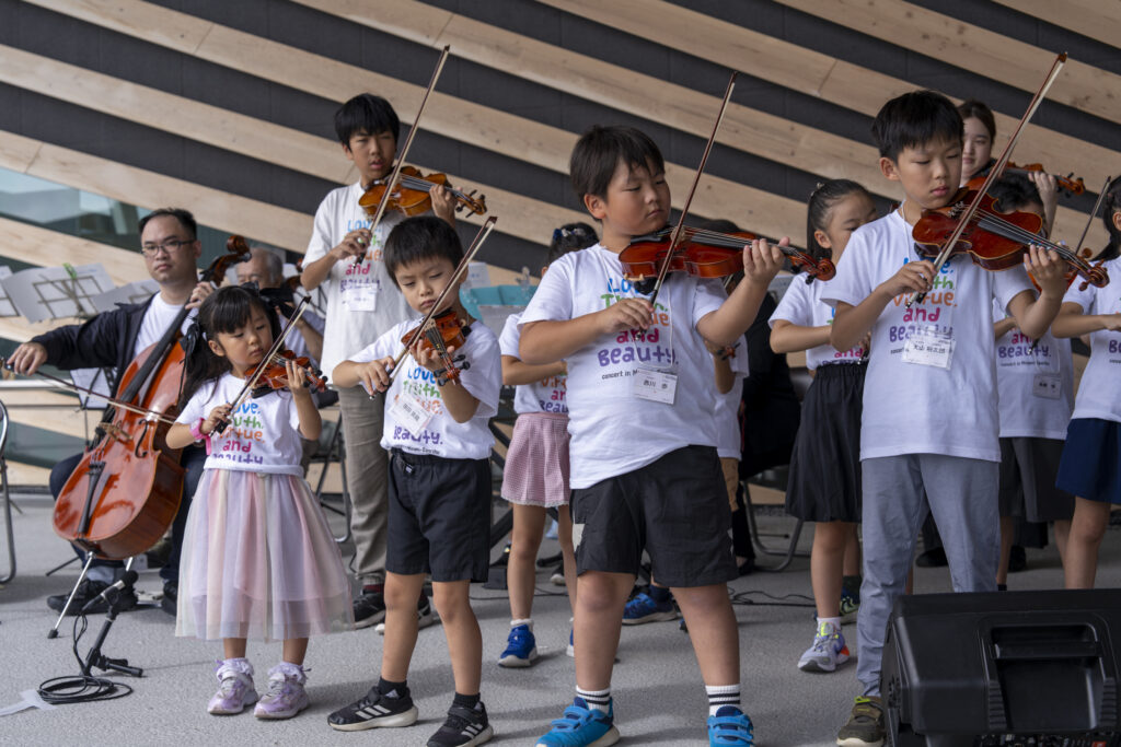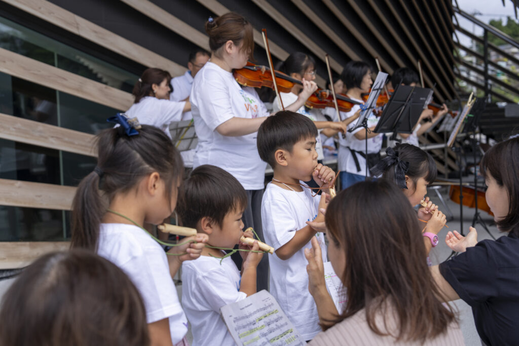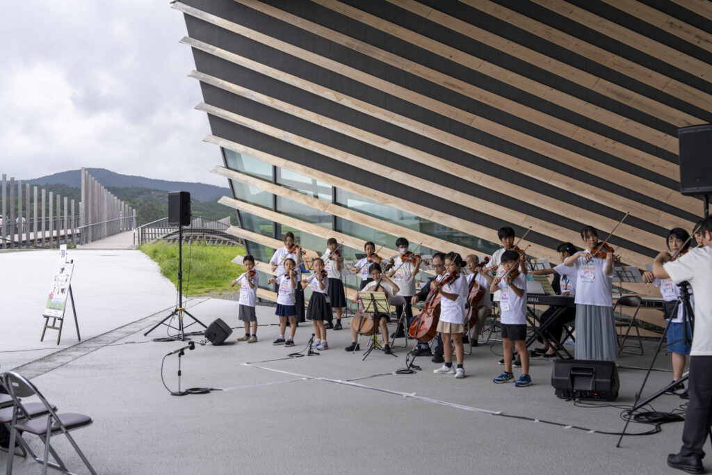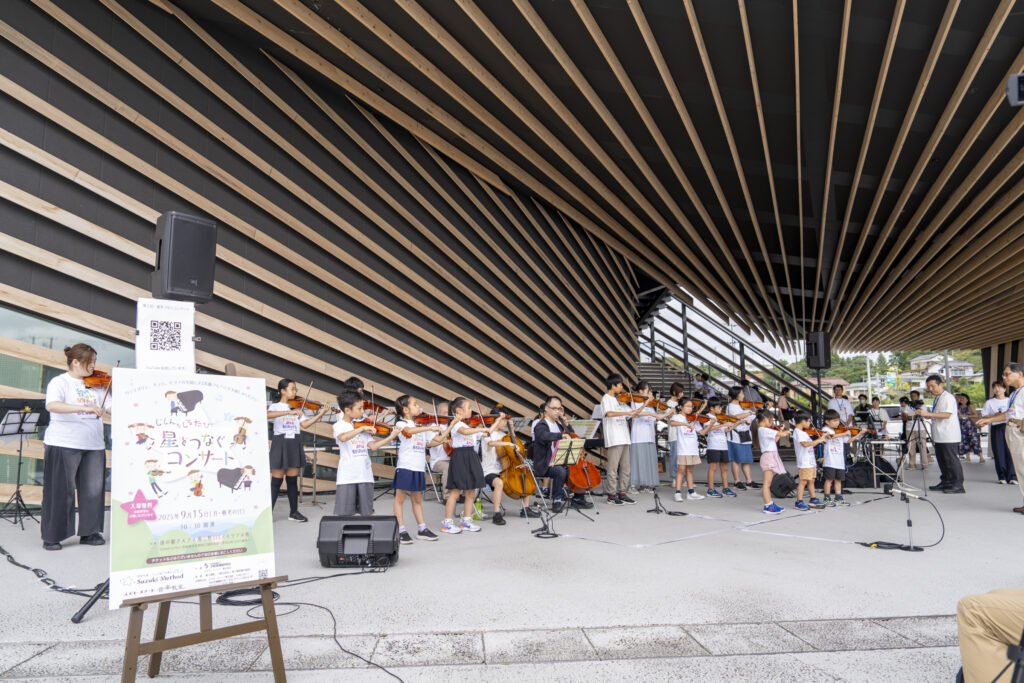 2日目は、隈研吾氏設計の大屋根が印象的な南三陸311メモリアル前でコンサートを開催。リハーサルが始まると徐々に観客が集まり、観光客や地元の方々が足を止めて聴き入っていました。音楽を通して育んだ心を、スズキ・メソードのシンボルである「星」に託して、他者へとつないでいくーーコンサートのタイトルに込められた温かい思いが語られ、演奏がスタートしました。曲目は、誰もが聞いたことのあるクラシックの名曲、映画音楽から童謡まで。一曲ごとに温かい拍手が響き、演奏する生徒さんたちの表情も次第に和らいでいきます。