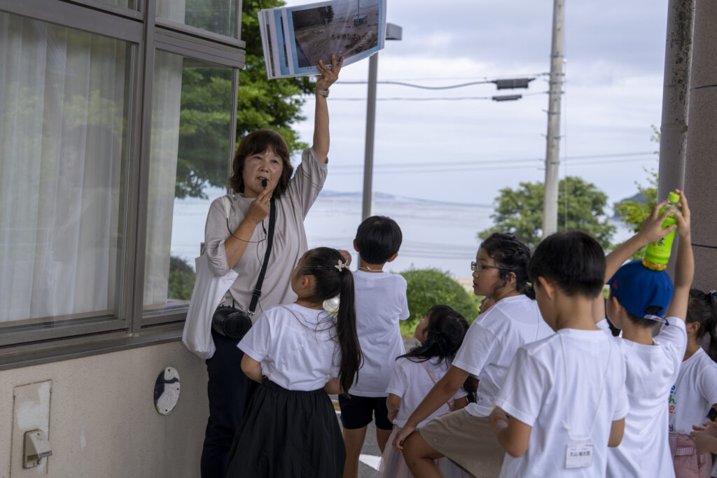 「戸倉地区の到達水位は22メートルです」という言葉に、参加者のみなさんから思わず「えー!」という声が。戸倉中学校を訪れた生徒さんは「こんな高さまで津波がきたなんてありえないと思った。自分がここに住んでたらどう感じただろう」と語り、未就学の小さな生徒さんでも、精一杯想像力を働かせて震災というものを受け止めている様子が見てとれました。