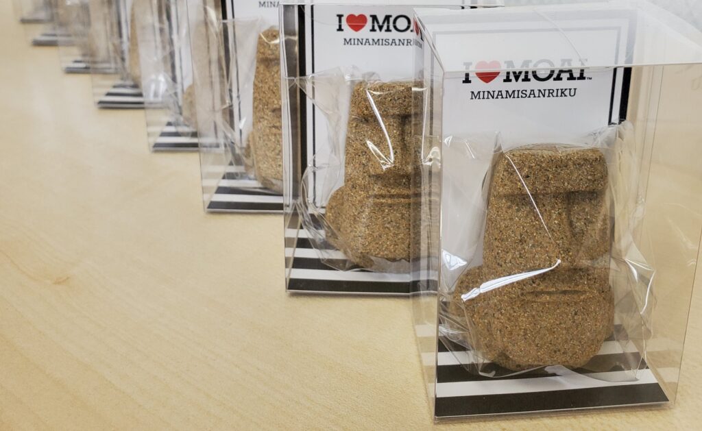 | プログラム内容 | 南三陸町とモアイの関係性についての映像をご覧いただいた後、絵付け地体験を行います。 砂像のモアイ像には町内海水浴場の砂が入っています。目や頭、ほっぺなどを自由にペイントしてオリジナル「モアイ像」を作ることができます。作品はすぐに乾きますので、専用の箱へ入れて持ち帰れます。 |