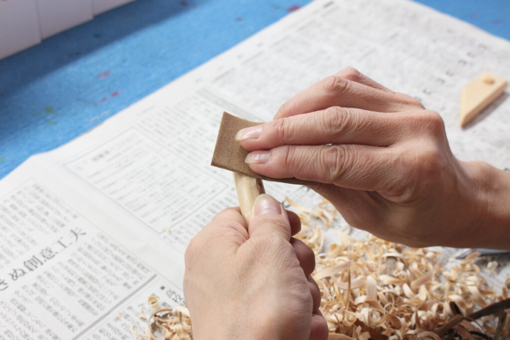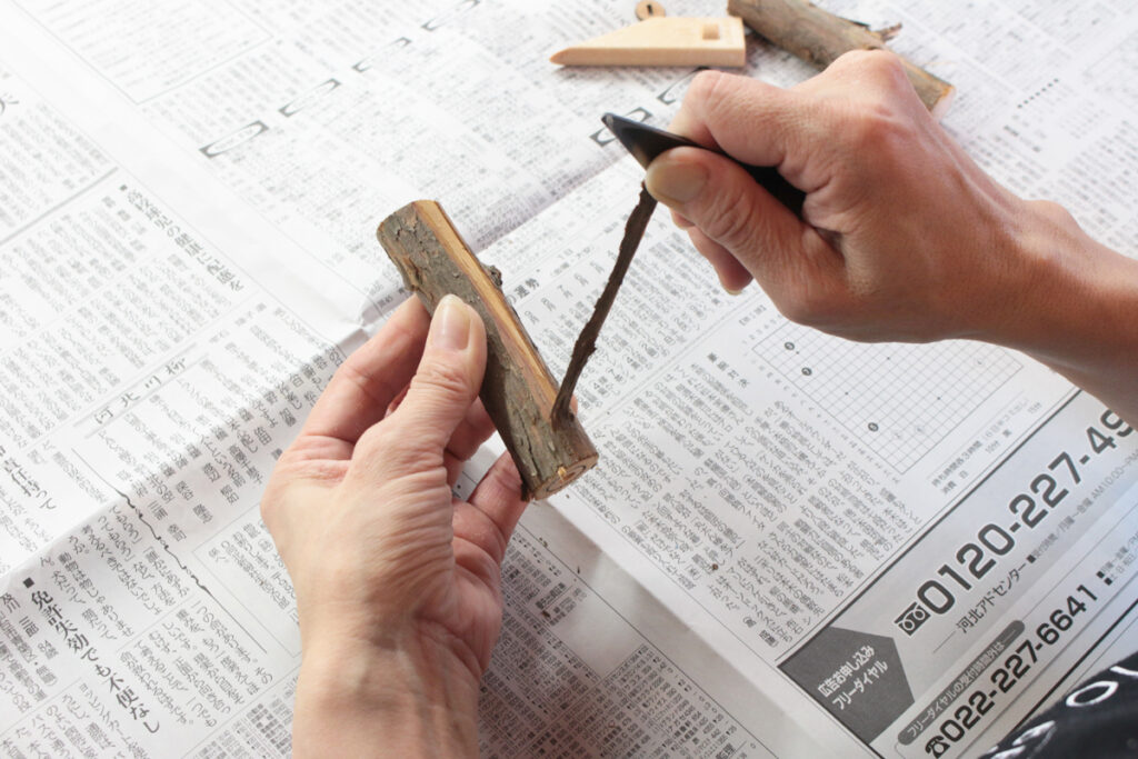 - インスピレーションでお気に入りの木材を選び、小刀で薄皮を剥ぎ、紙やすりで丁寧に磨いていきます。