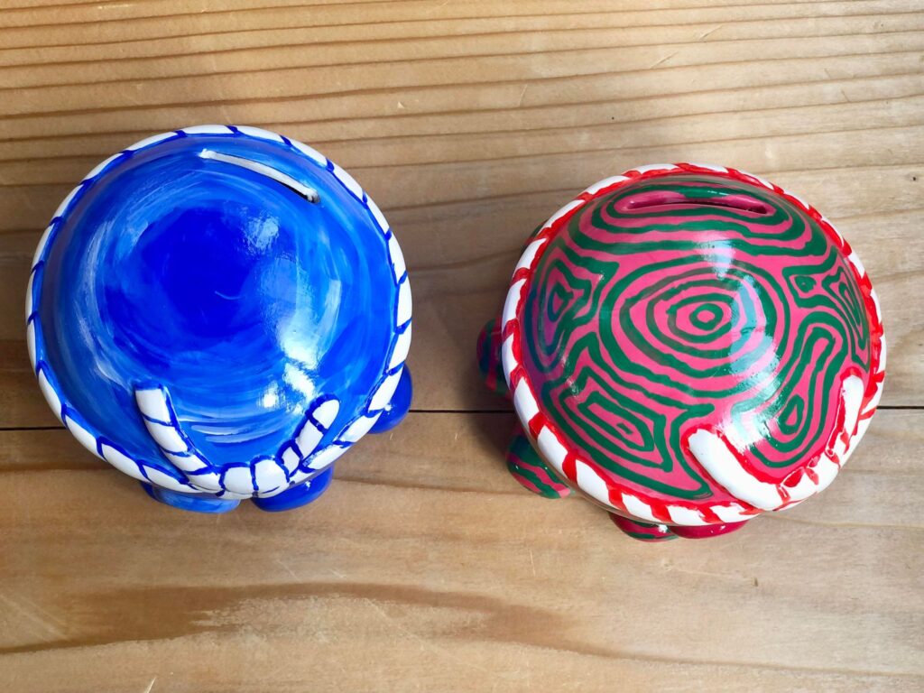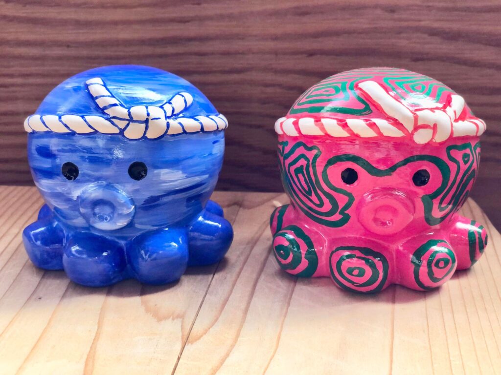 南三陸町の名産であるタコをモチーフとした「置くと(試験に)パス」する縁起もの「オクトパス君」の貯金箱の絵付け体験です。