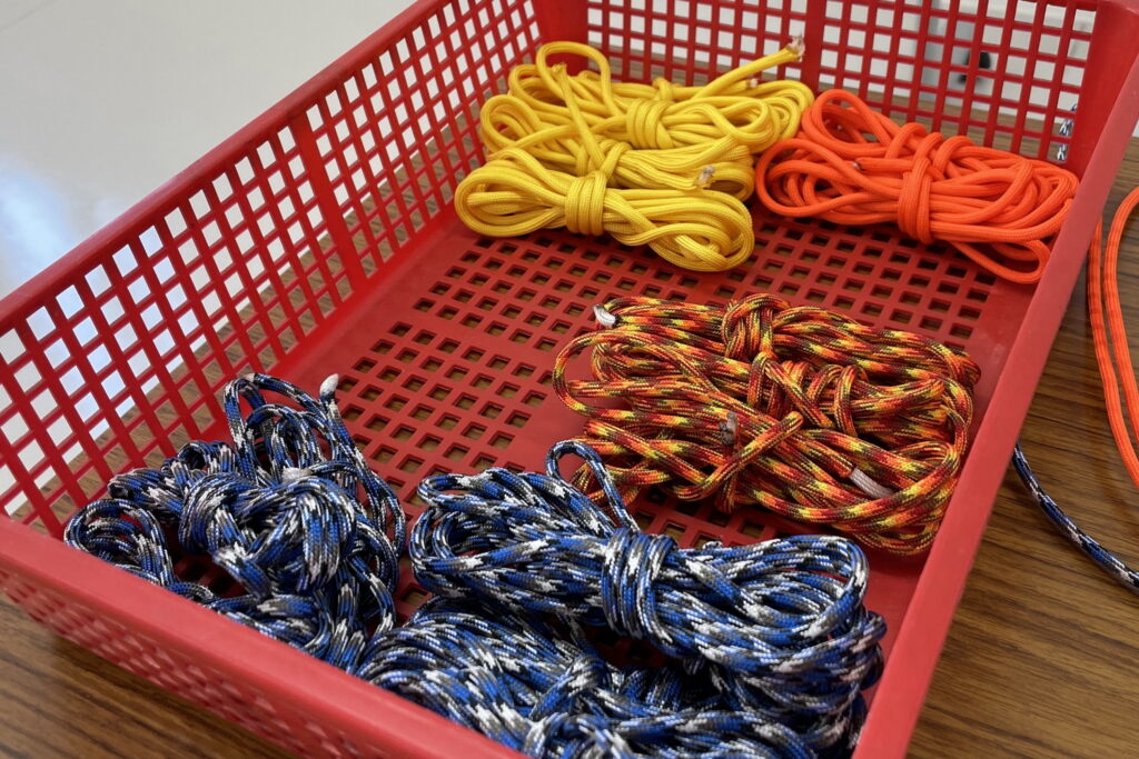 震災の教訓から「備え」の大切さを考えるプログラム。ラシュートにも使われる頑丈な紐(パラコード)を使い、災害時に解いて活用できる機能的なキーホルダーを製作します。