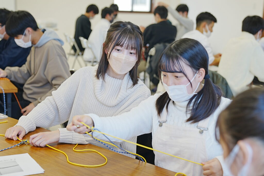 一段ずつ編み進める工程を通じて、限られた資材で工夫する「生き抜くための知恵」を習得。いざという時に役立つ技術を学ぶ時間は、生徒たちの防災意識を実践的なものへと高めます。