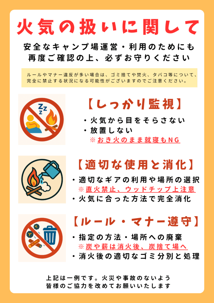 ゴミの廃棄やタバコに関してのルール変更と合わせまして、改めまして「火気の取り扱い」について以下ご確認をお願いいたします。