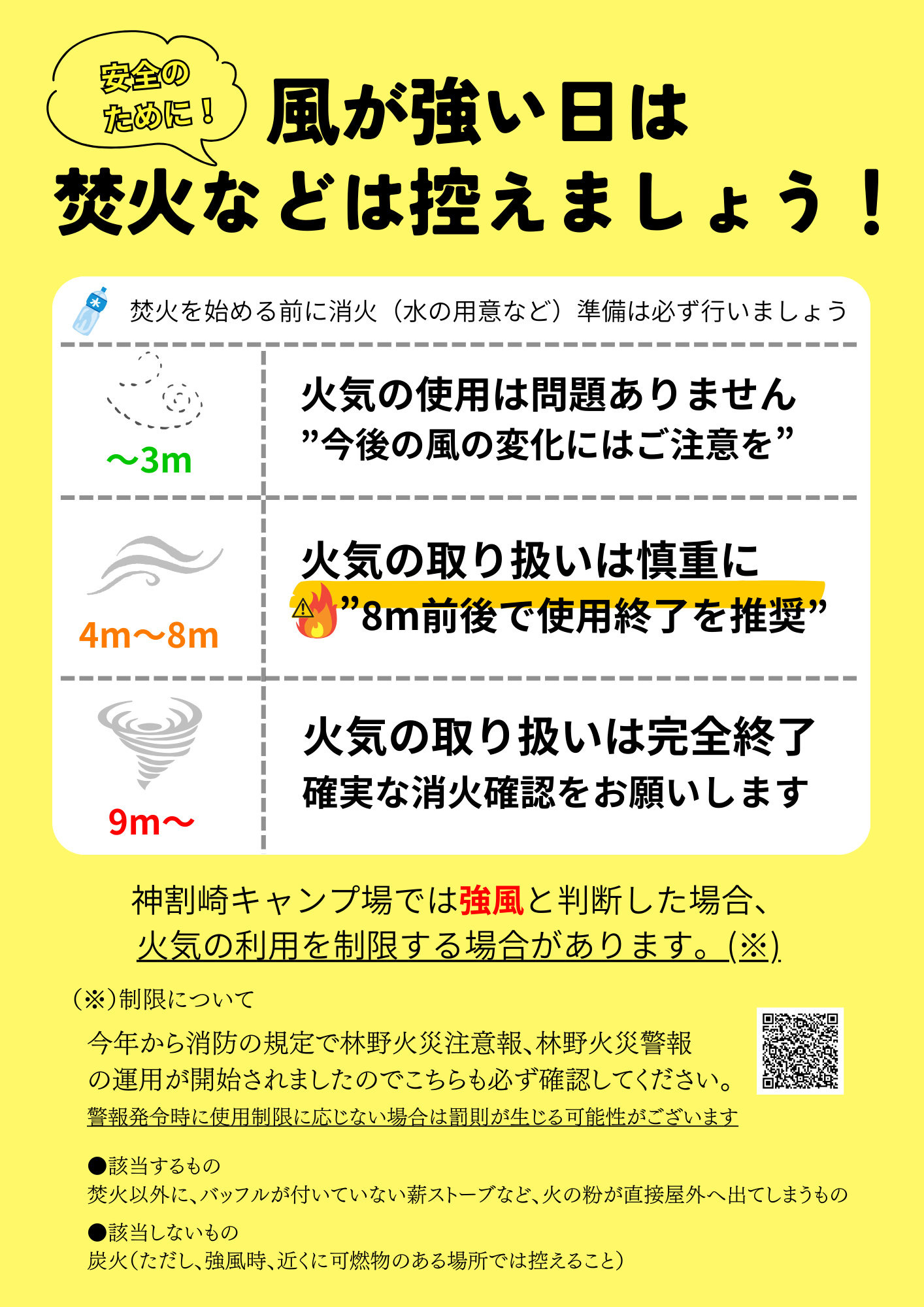 風速を判断基準としつつも、身の危険を感じるときは無理せずにご判断(焚火や火気の利用を控えるなど)ください。