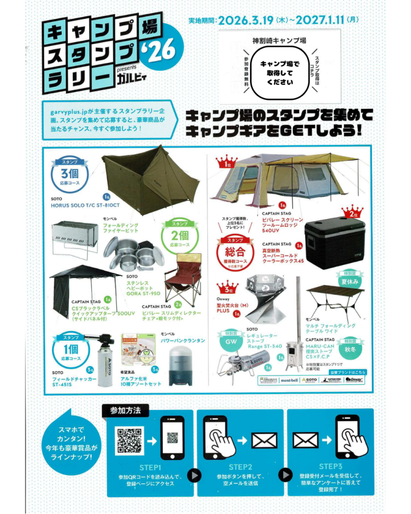 全国72カ所のキャンプ場でスタンプが取得でき、スタンプの数に応じて豪華賞品に応募できます。しかも、1スタンプから応募も可能ですので、神割崎キャンプ場で参加(取得)していただくだけでもOKです。
