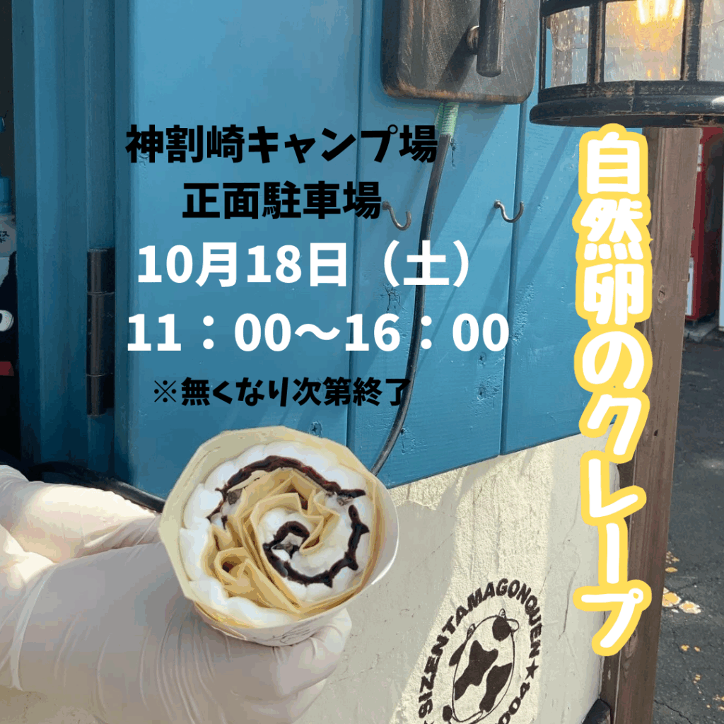 10月18日(土)に神割崎キャンプ場正面駐車場にて、「自然卵のクレープ」の移動販売が行われます。 イベントに出店するたび行列ができる人気のクレープ屋さん。久しぶりの出店です!キャンプ場でも定期的に出店いただいてキャンパーさんにも地域の方々にも大... -