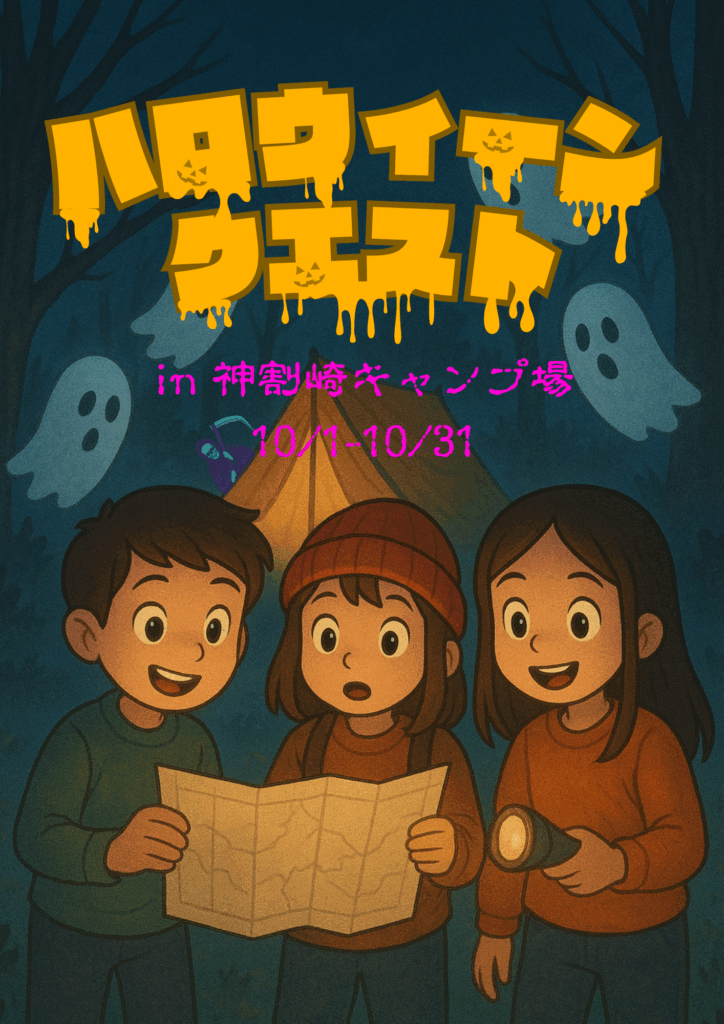 神割崎キャンプ場では、10月1日~31日の期間中、場内を巡る周遊型イベント「ハロウィーンクエスト」を開催します。なぞなぞを解いておばけを探したり、ワークショップに参加したり、スタンプを集めたりと、子どもたちが楽しめる3つのクエストを用意してい... -