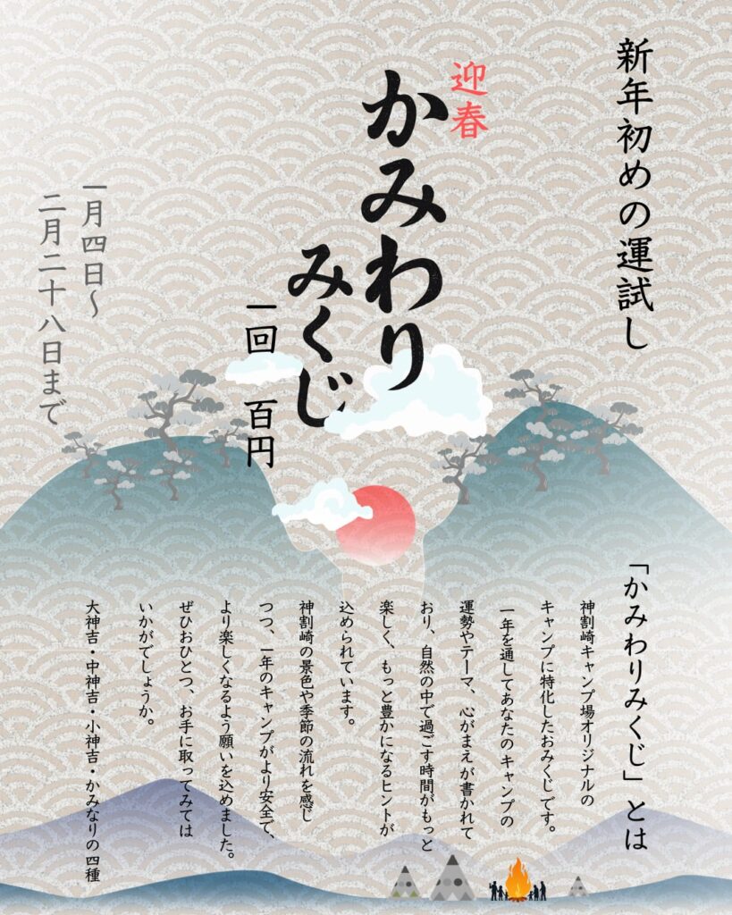来年の1月に”かみわりみくじ”を開始いたします。かみわりみくじは、神割崎キャンプ場オリジナルの「キャンプにまつわること」をテーマにしたおみくじです。 引いた瞬間だけで終わらない、今年1年のキャンプ運・過ごし方・心がまえ が書かれており、初心者... -