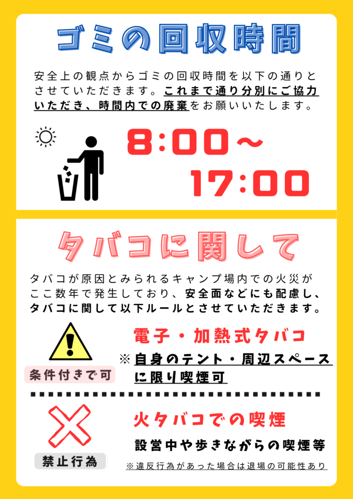 また、キャンプ場は多くの方がご利用になる場です。ルールは常識的な範囲ですので、お守りくださいますようお願いいたします。