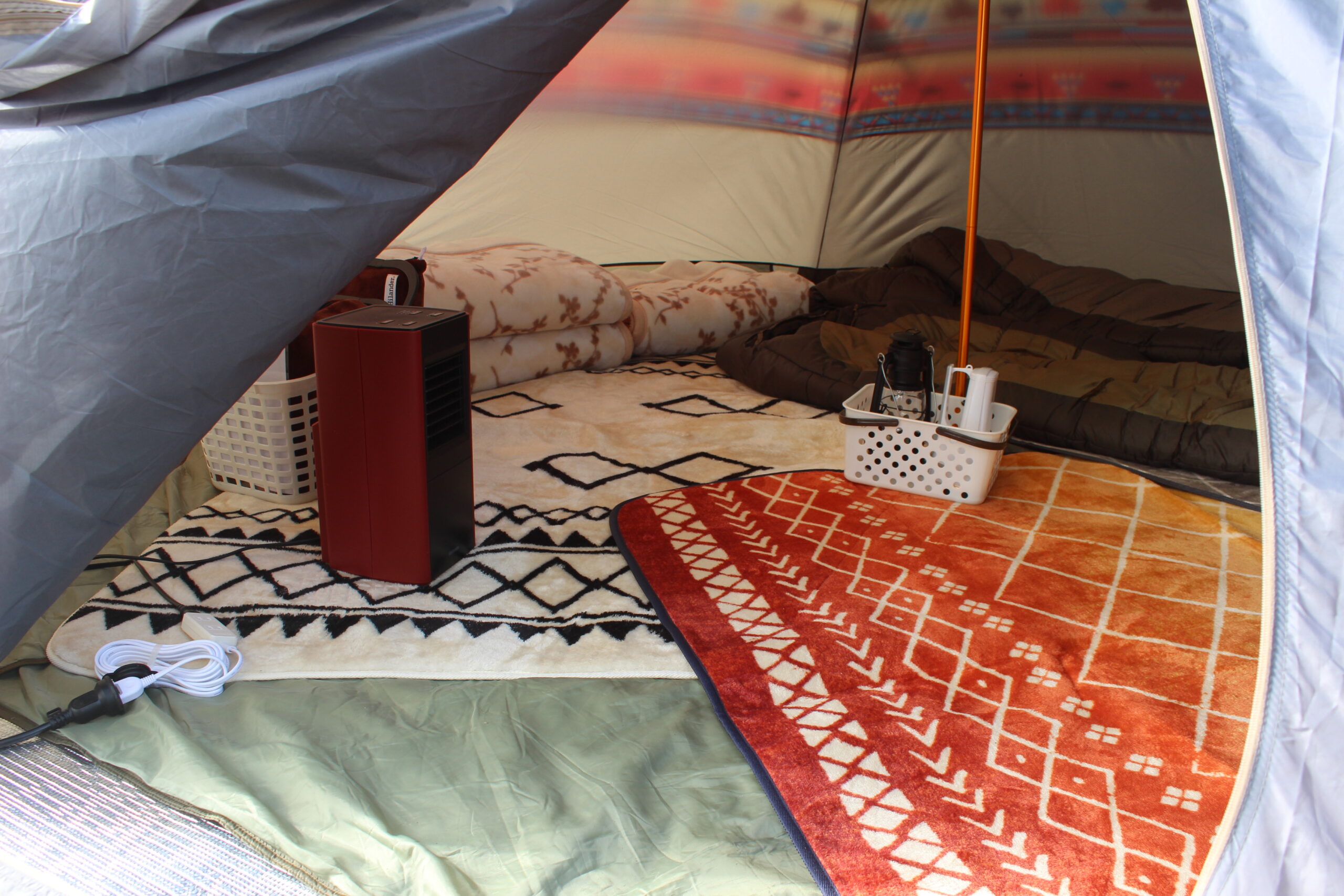 | 備品 | テント、タープ、寝袋、毛布、保温用マット、ランタン、イス、テーブル、BBQ用コンロ、着火道具(着火剤、チャッカマン、うちわ)、ゴミ袋、調理器具、食器類 | テント、タープ、寝袋、毛布、インナーマット、ラグマット、ランタン、ブランケット、暖房器具(電気ヒーター)、焚き火セット(焚火台、薪、着火剤など)、イス、テーブル、ゴミ袋、調理器具類(カセットコンロ、タコ飯用メスティン、海鮮スープ用鍋など)、食器類 |