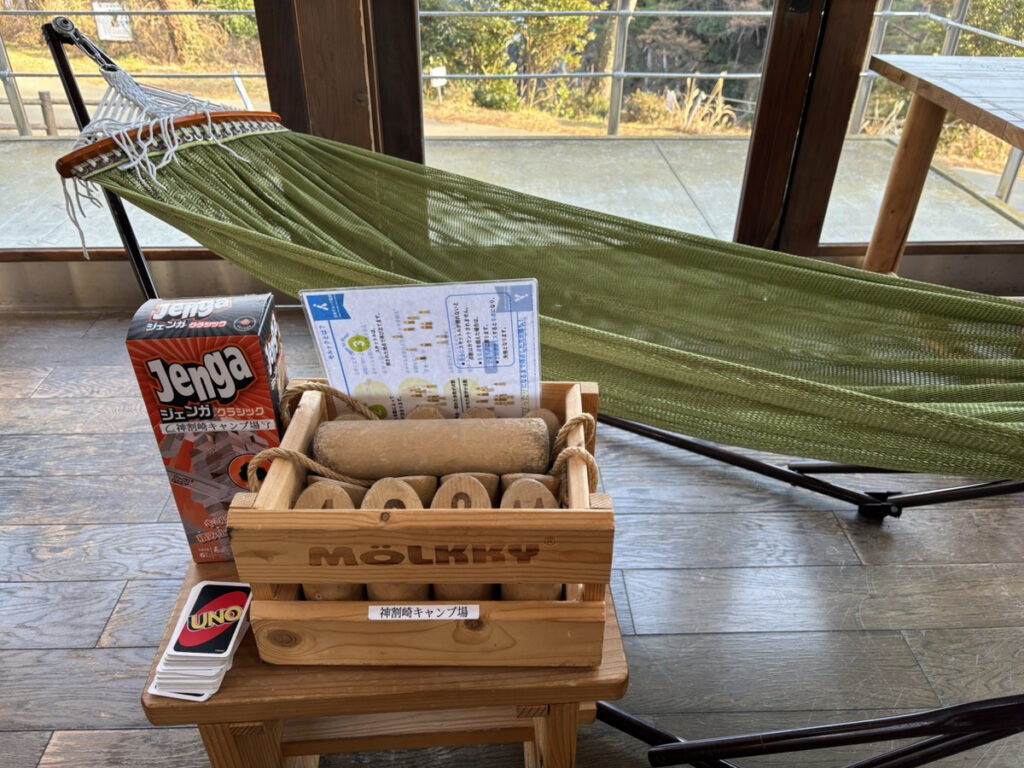 ・デッキにテントを固定するためのカラビナ付きペグを無料で貸出します
