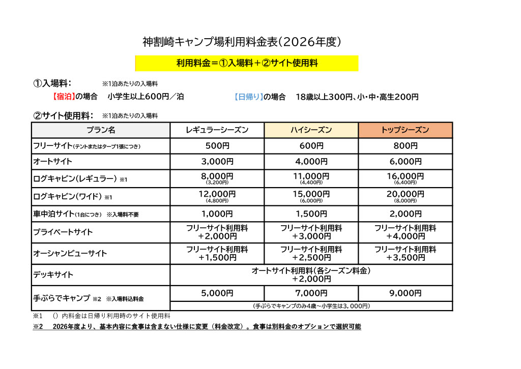 上記は基本料金(レギュラーシーズン)となりますが、2025年度より、神割崎キャンプ場ではシーズン料金(3タイプ)を設けての運営となります。