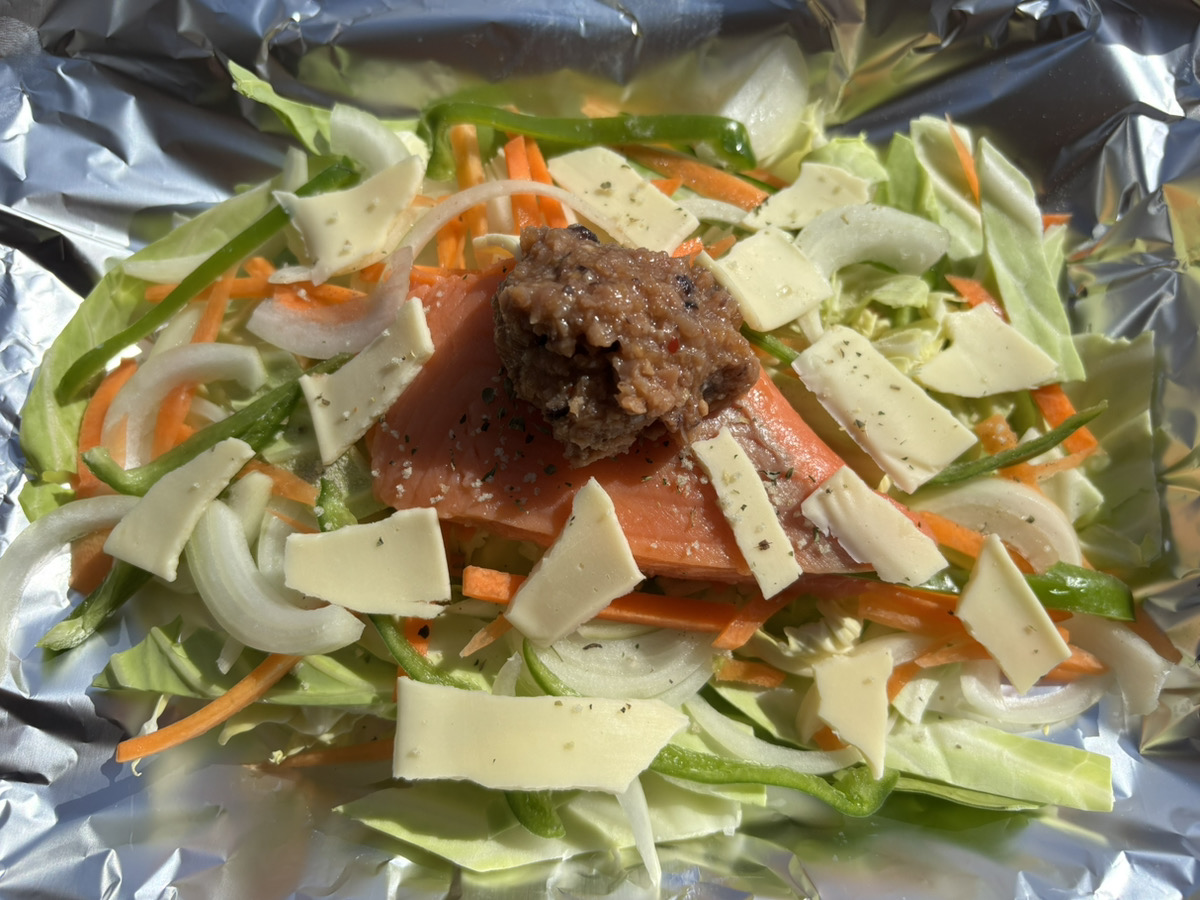 牡蠣と野菜の上にキャンプ場特製のタコ味噌やチーズをのせてホイルで包みました。ホイルのまま鉄板や網で焼いていただくだけのお手軽食材。牡蠣は3~4個