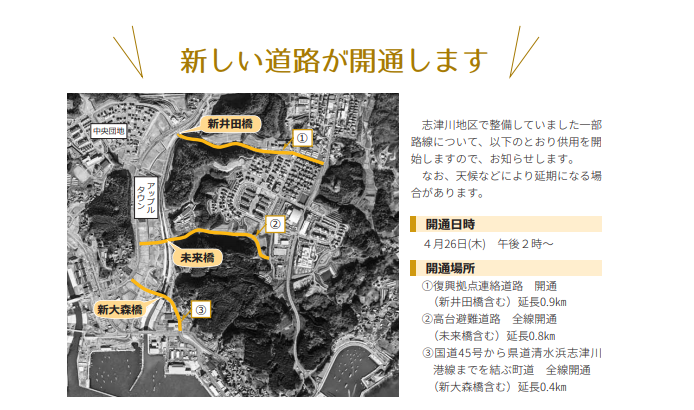 ① 新井田橋を通る復興拠点連絡道路 延長0.9km