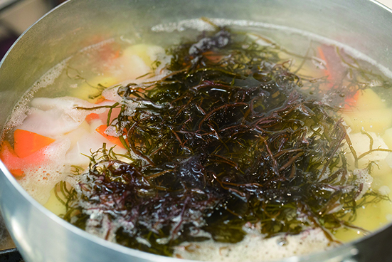 お味噌汁の仕上げに新鮮なフノリを入れて、いただきます!