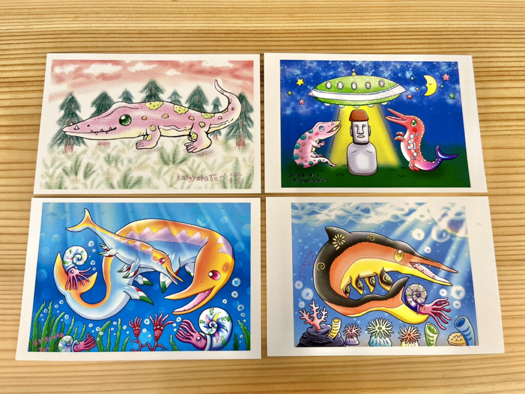 宮城県在住で南三陸町古生物好きなアーティスト「海魚爬Ton(かいぎょはトン)」さんによる、古生物モチーフのオリジナルデザインポストカードを、歌津総合支所にて配布中です。