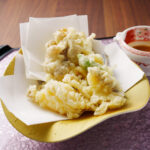 あわびの天ぷらに特製うにソースを付けて、贅沢にお召し上がりください